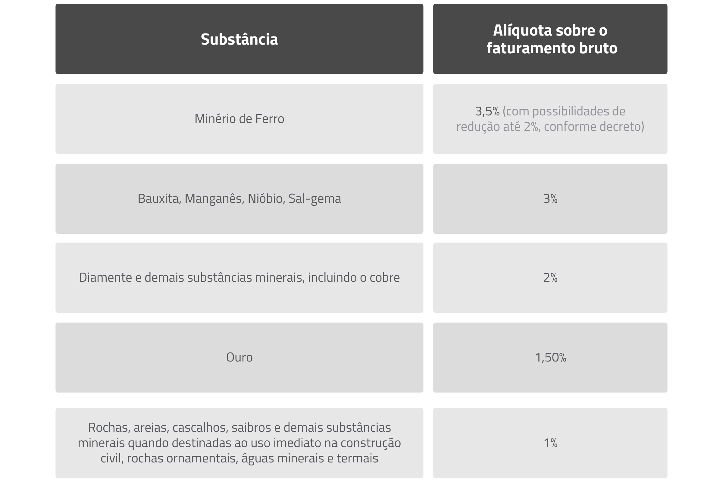 O cálculo da CFEM varia conforme a substância mineral explorada, com alíquotas que vão de 1% a 3,5%. As alíquotas aplicáveis para cada substância podem ser consultadas em tabelas oficiais disponibilizadas pela ANM.