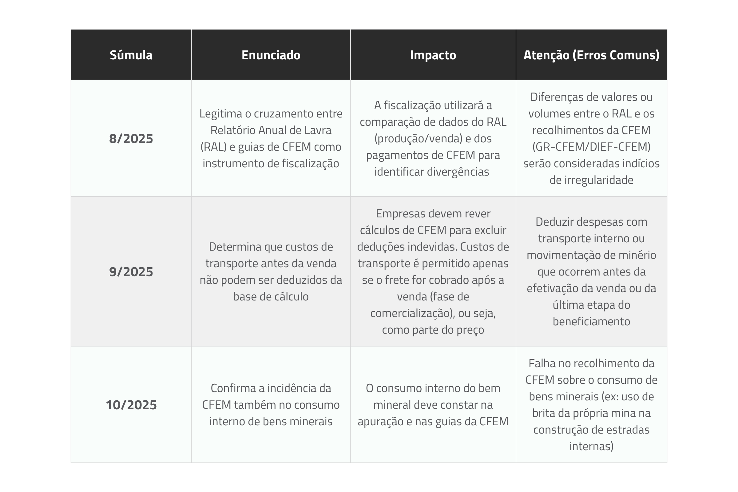 - Súmula nº 8: autoriza o cruzamento automático entre o Relatório Anual de Lavra (RAL) e as guias de CFEM para fins de fiscalização;