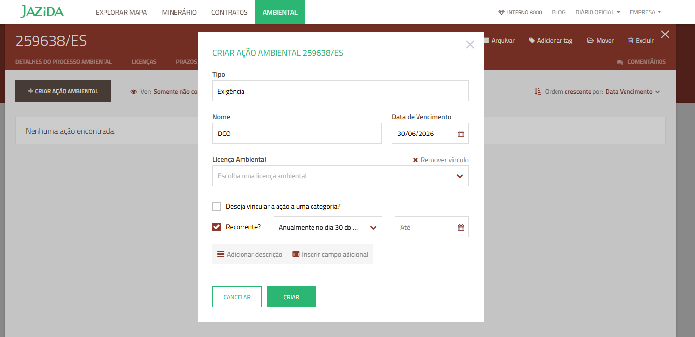 O Jazida.com permite centralizar documentos como PAEBM, DCO e DCE no Módulo Ambiental, além de emitir alertas automáticos sobre prazos e criar ações personalizadas para cada etapa da Avaliação de Conformidade e Operacionalidade (ACO), garantindo o envio da DCO dentro do prazo e com total rastreabilidade.