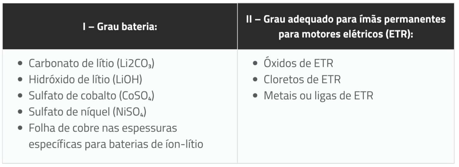 Esses minerais já constavam no Decreto 11.964/2024 e são cruciais para baterias, motores elétricos, sistemas magnéticos, armazenamento de energia e infraestrutura de mobilidade elétrica.
