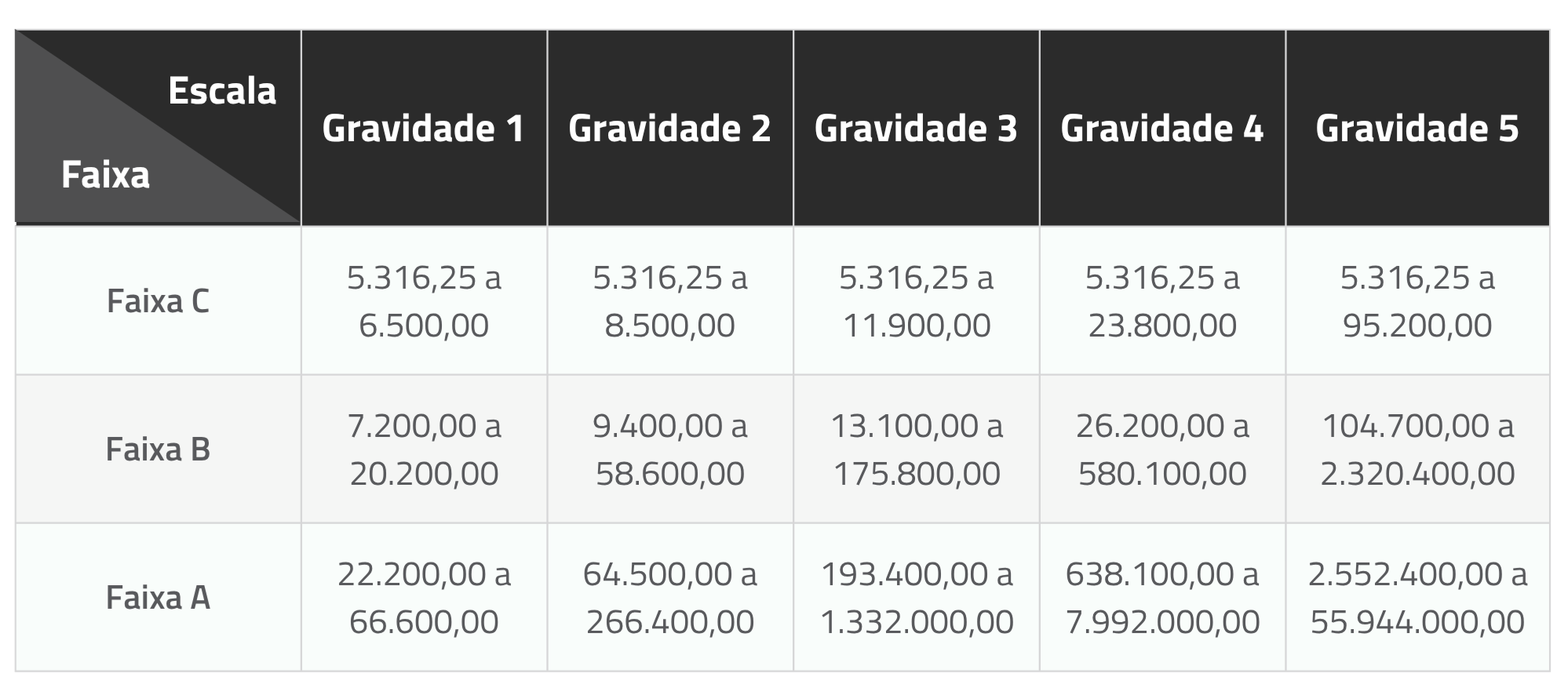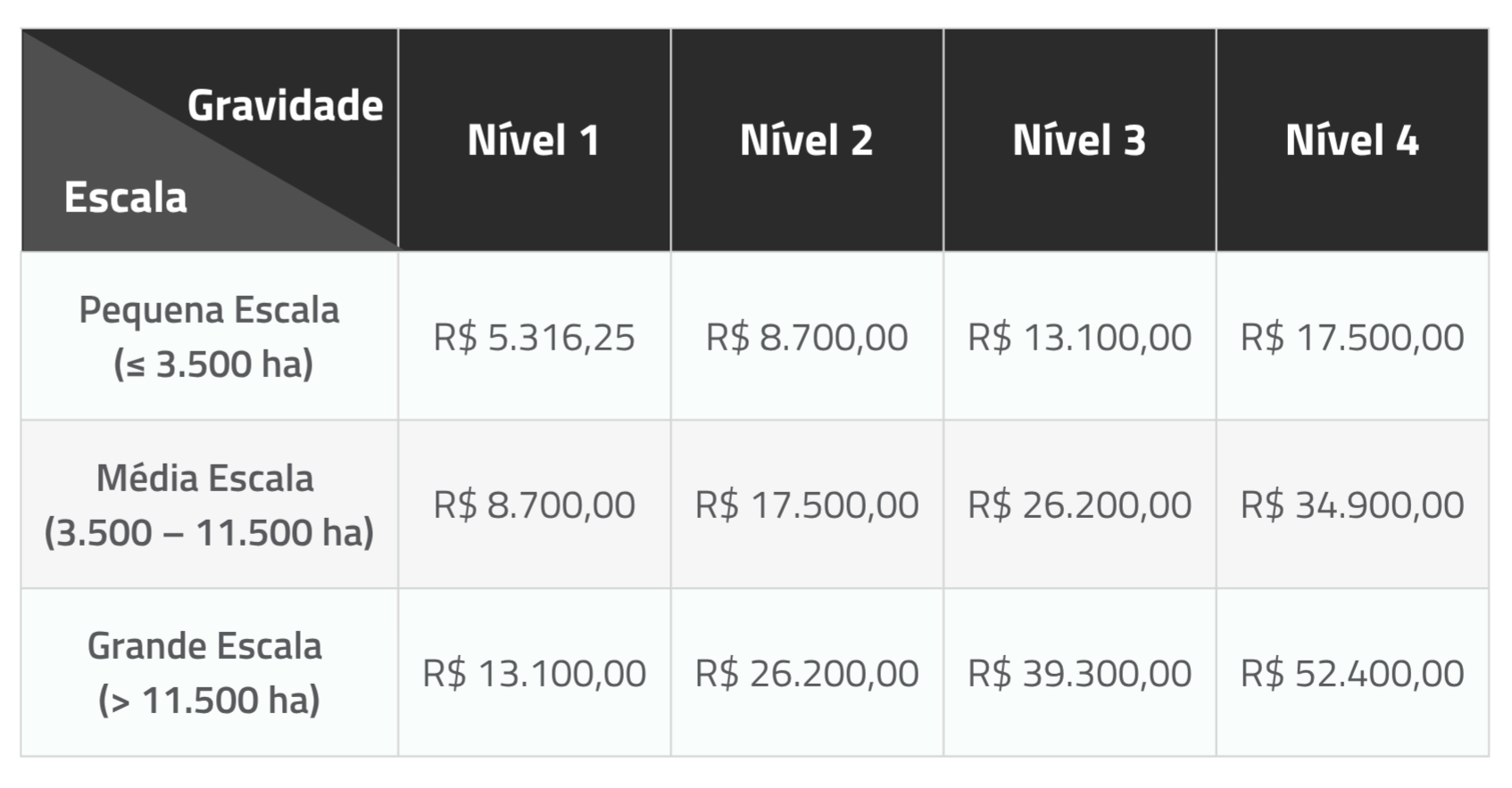 Os valores representam o valor-base das multas conforme a escala do empreendimento (área total dos alvarás vigentes) e o nível de gravidade da infração.