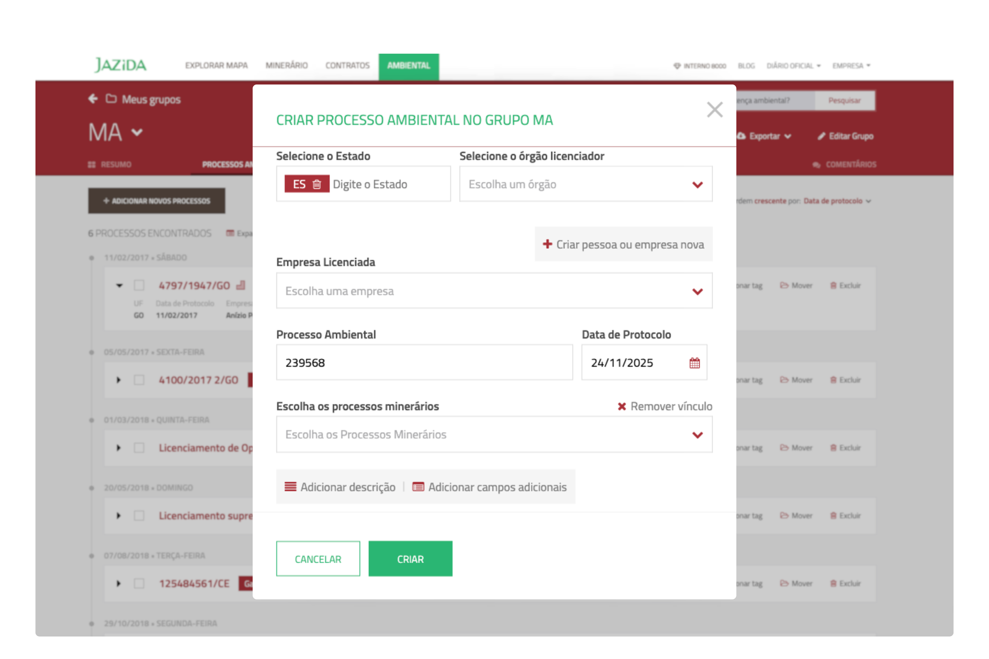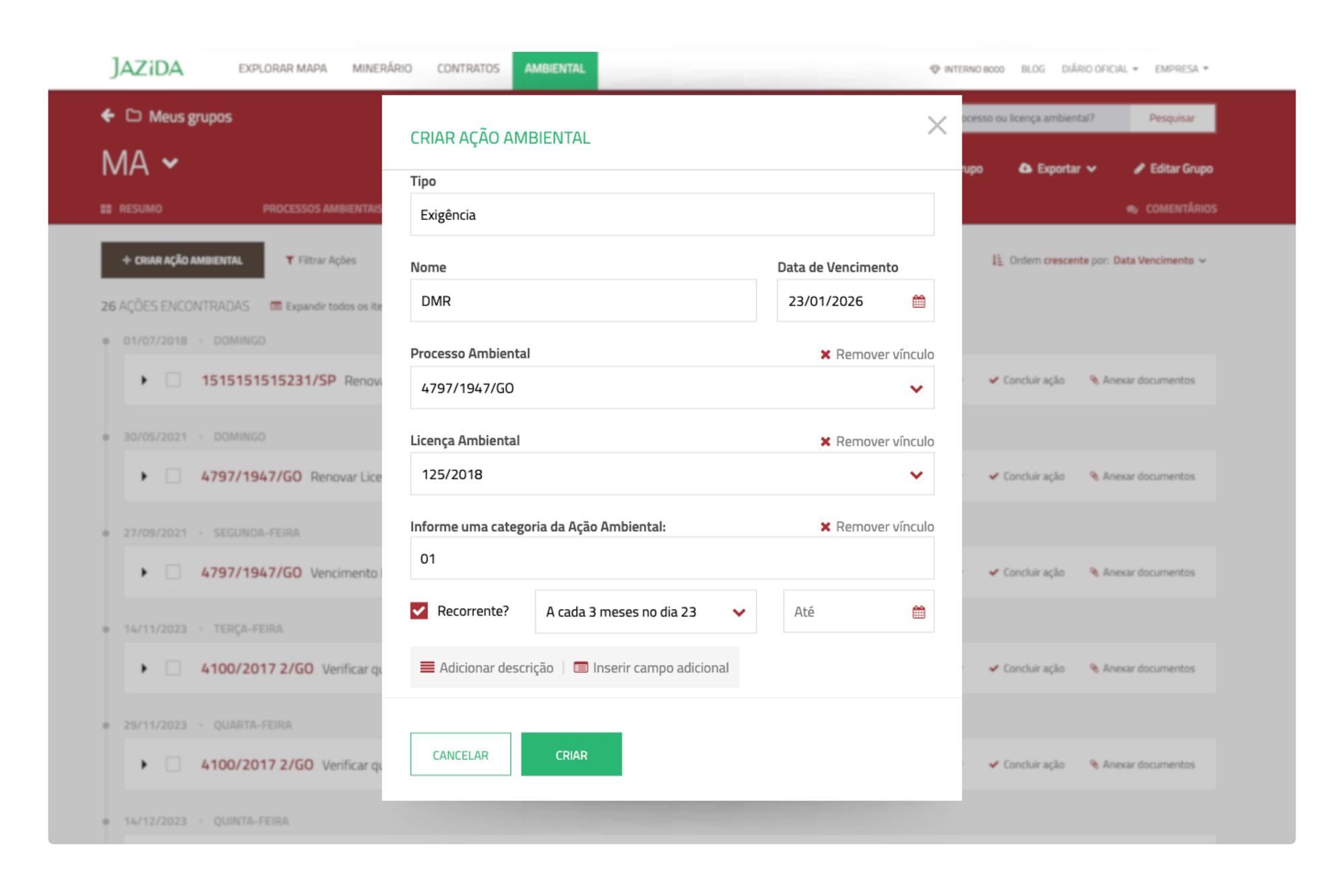 Com o módulo ambiental do Jazida, o usuário pode centralizar e acompanhar todas as obrigações ambientais do empreendimento, criando ações personalizadas para cada exigência específica, como o envio de MTR, DMR ou relatórios de PGRS. Essa funcionalidade é essencial, já que o sistema não gera automaticamente essas obrigações, permitindo que cada operação configure seus próprios prazos e responsabilidades conforme a realidade do empreendimento.