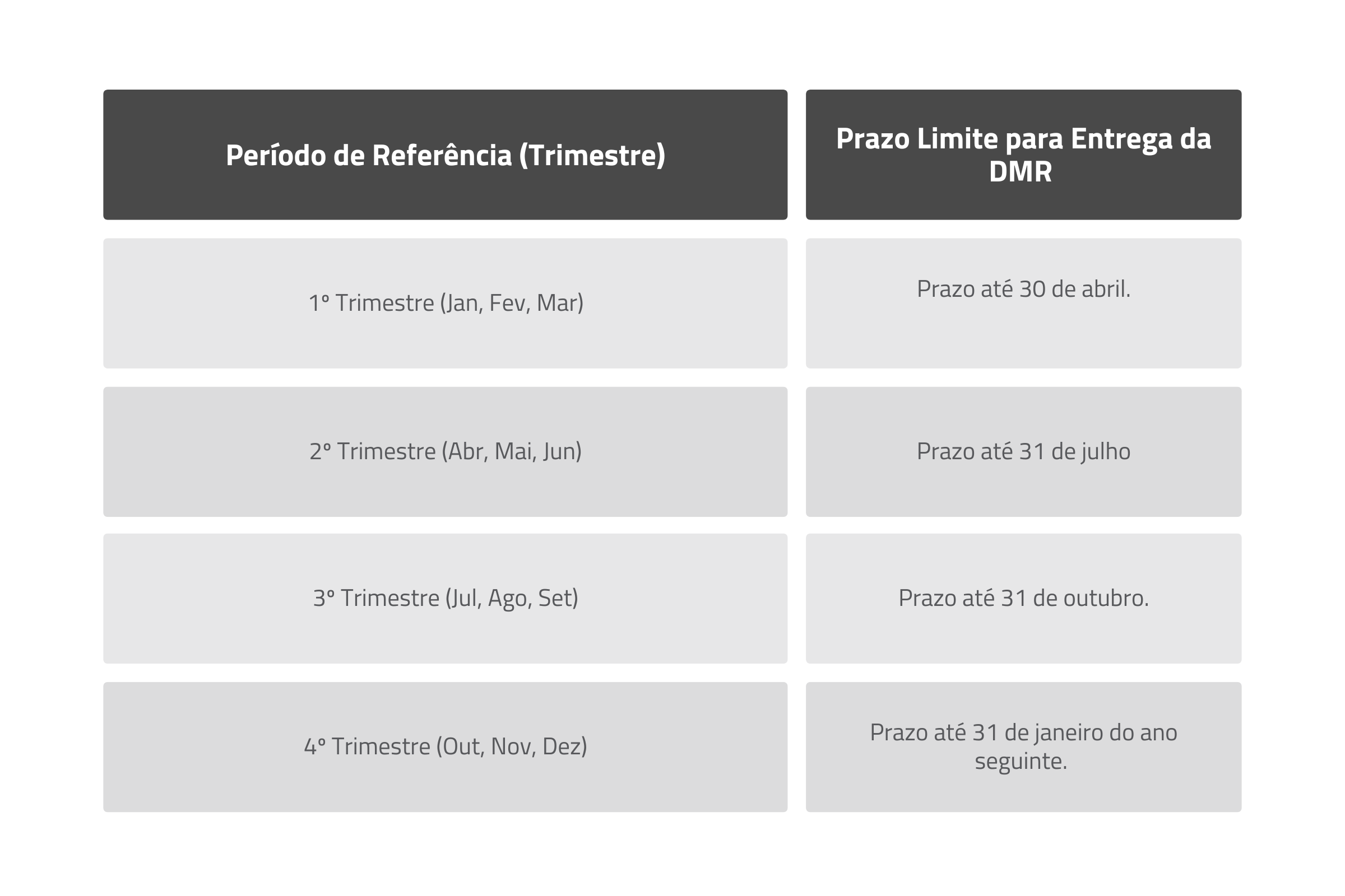 A consolidação e envio da DMR, referente ao trimestre anterior, deve ser realizada até o último dia do mês subsequente ao encerramento do trimestre.